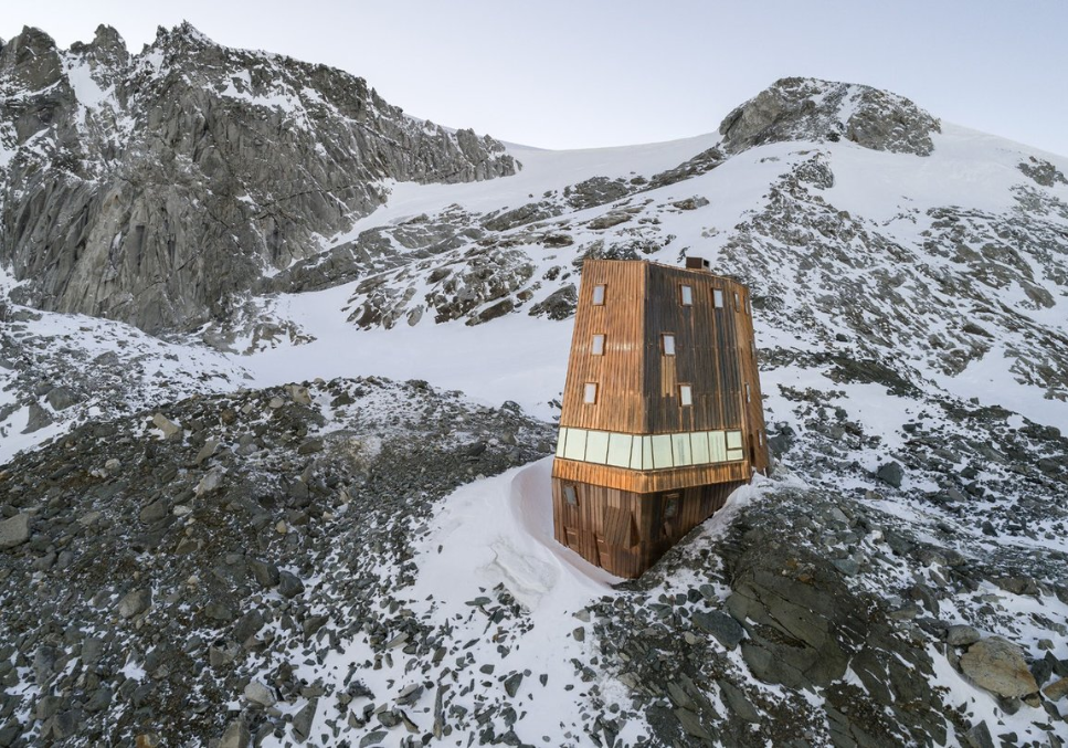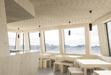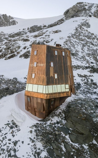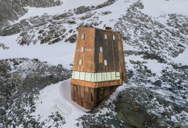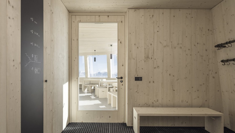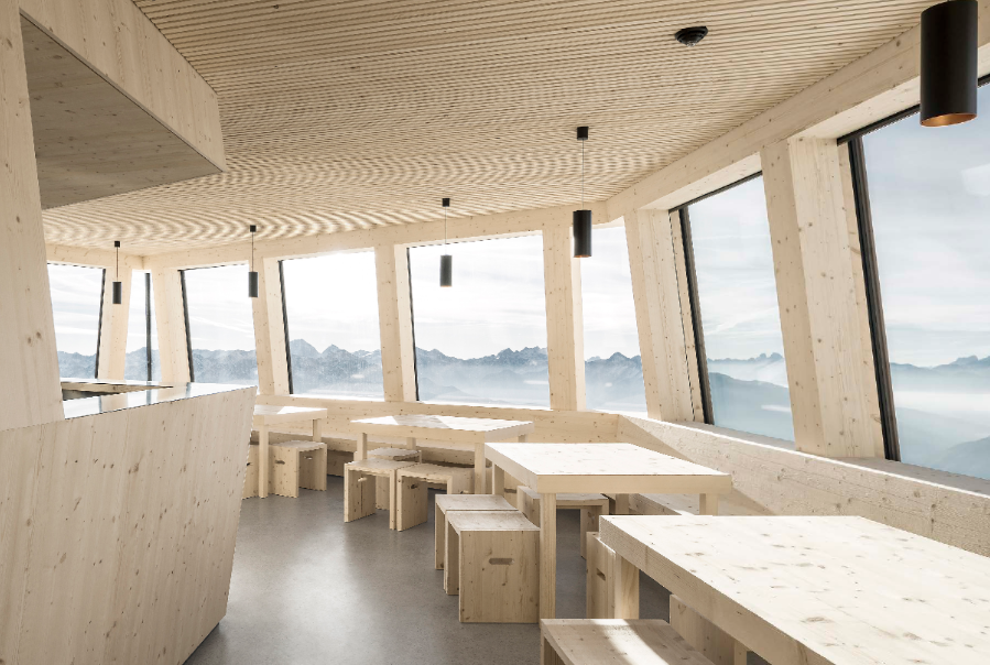 Einen ganz besonderen Rückzugsort können Wanderer, Kletterer und Skifahrer im Südtiroler Teil der Zillertaler Alpen genießen. Auf einer Höhe von 3026 Metern erwartet die Besucher der Rastplatz Schwarzensteinhütte: ein modernes Objekt, das mit der Natur verschmilzt. Die Fassaden sind zurücklehnend und überhängend gestaltet, ganz so als sei das Haus im Laufe der Zeit von Gletscher, Wind und Wetter geformt worden. Ein weiteres architektonisches Highlight ist die Kupferblechfassade, die bei Sonnenschein für ein eindrucksvolles Lichtspiel sorgt. Die Architekten wählten dieses Material in Anlehnung an den damaligen Kupferbergbau im nahen Ahrntal. Im Kontrast zum auffälligen Äußeren steht das minimalistisch gehaltene Innere. Hierzu hat der E/D/E Vertragslieferant SIMONSWERK beigetragen.