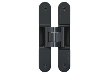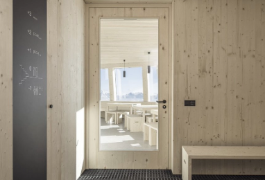 Der funkelnde, von Menschen erschaffene Bergkristall lässt sich auch von innen bewundern. Dort erwartet die Besucher ein naturnahes Ambiente. Die Räumlichkeiten sind mit unbehandeltem Fichtenholz ausgebaut. Die Gestaltung ist zurückhaltend und hält die Natur im Mittelpunkt. Um diese besondere Stimmung zu kreieren, zählte bei der Gestaltung jedes Detail. So war auch die Wahl der Türbänder entscheidend. Das Architekten-Team Stifter und Bachmann entschied sich für Bänder der SIMONSWERK GmbH. Um das Design im Türbereich optimal fortzuführen, kamen die TECTUS TE 340 3D und TECTUS TE 527 3D des E/D/E Vertragslieferanten zum Einsatz. Die Bänder liegen vollständig verdeckt, sodass bei geschlossener Tür nur das Relief sichtbar bleibt. Die Farbwahl fiel auf mattes Tiefschwarz, einen Farbton, der sich auch in der Maserung im Holz wiederfindet und zudem einen spannenden Kontrast zum hellen Fichtenholz darstellt.